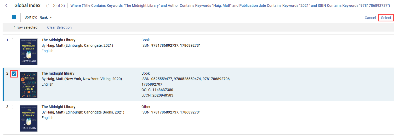 Check the Checkbox for the record with the listed pod information and click Select. This will populate Information from the new record to the Rapido request. At this stage it is recommended to remove the ISBN from items with multiple ISBNs to get the broadest access to results on the record. Click Recalculate Partner to send the request to the new record. A few things may happen at the next step.